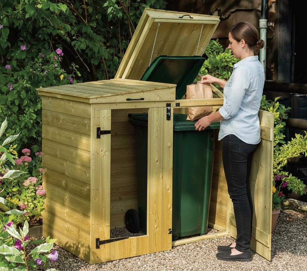 A: The bin store is crafted from natural timber and is pressure treated to prevent rot.