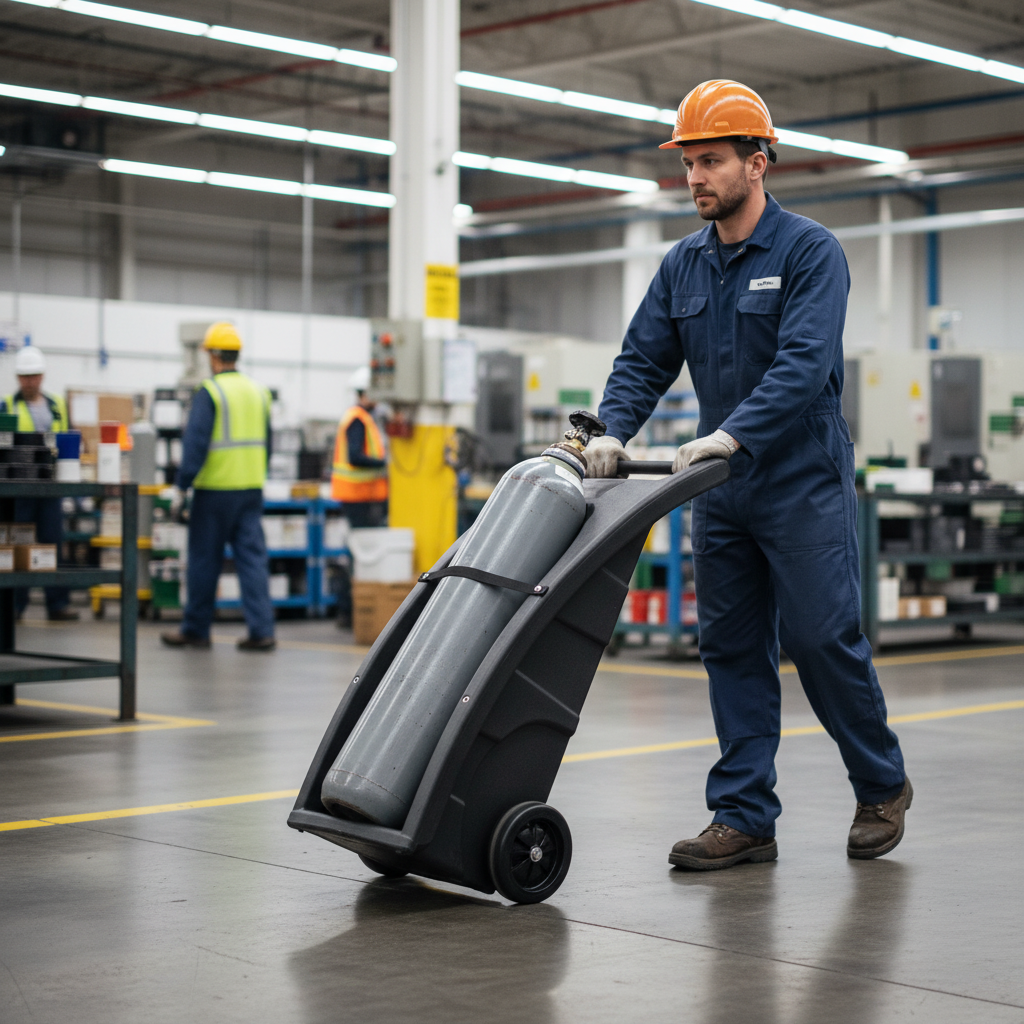 The Premium Gas Cylinder Trolley provides a simple yet effective solution for safely storing and maneuvering a single gas cylinder, making it particularly ideal for maintenance departments and welding facilities. This trolley is manufactured from naturally, non-sparking plastic, ensuring added safety when dealing with volatile gases.