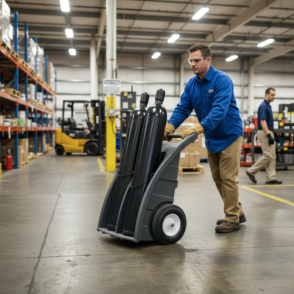 The Premium Gas Cylinder Trolley provides a simple yet effective solution for storing and maneuvering two gas cylinders, particularly in maintenance departments and welding facilities. Manufactured from naturally non-sparking plastic, this trolley enhances safety when dealing with volatile gases.