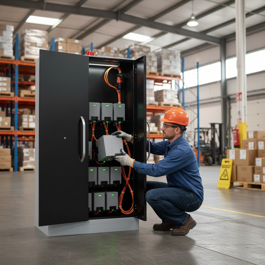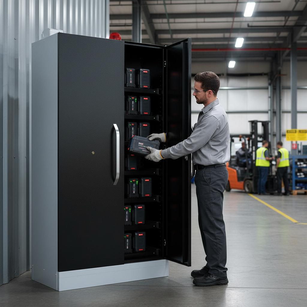 The cabinet is fitted with 4 perforated shelves and features a FirePro suppression system, which is an automatic fire detection and extinguishing generator triggered by a Thermo Activator bulb. This provides an additional layer of safety to reduce potential fire incidents during charging.